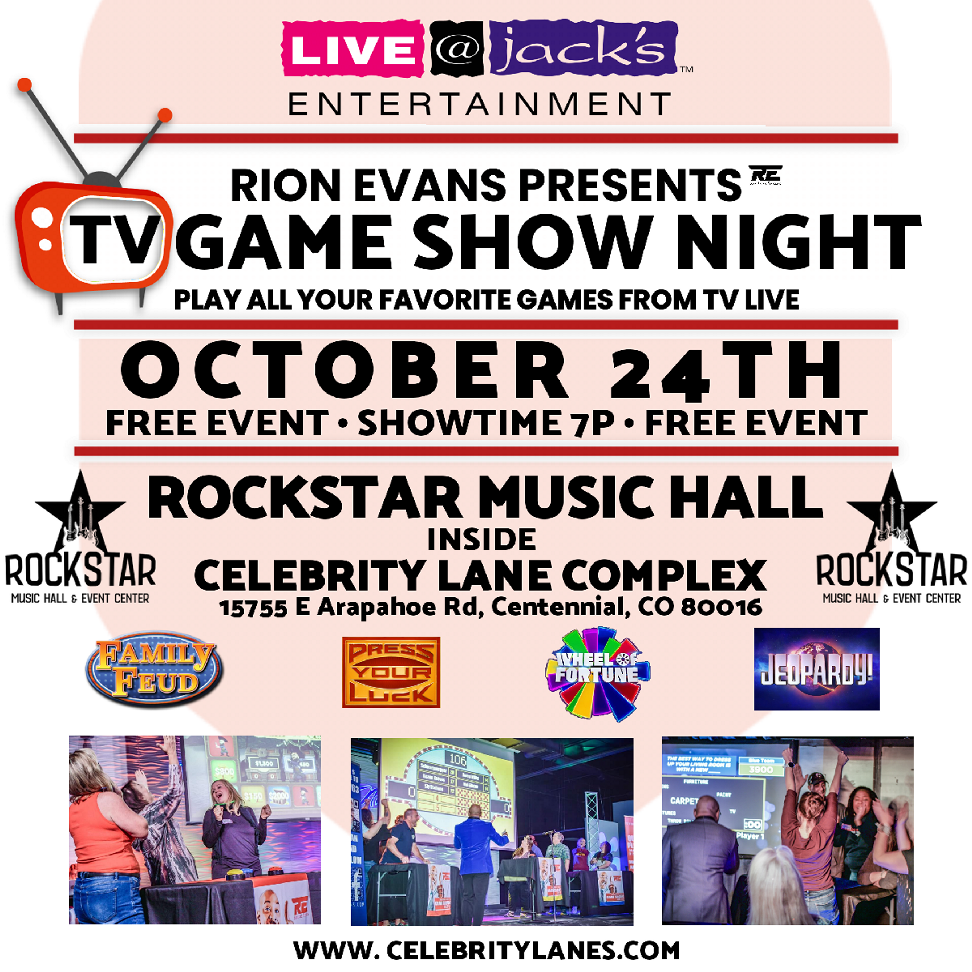 Come join us at RockStar Music Hall & Event Center for a night of entertainment like no other! Get ready to be part of the action in this interactive game show experience hosted by the one and only Rion Evans. It's a night of laughter, competition, and surprises that you won't want to miss. Immerse yourself in your favorite TV Game Shows! Play games like Family Fued, Wheel Of Fortune, Jeopardy, Pyramid and Press Your Luck. WIN PRIZES